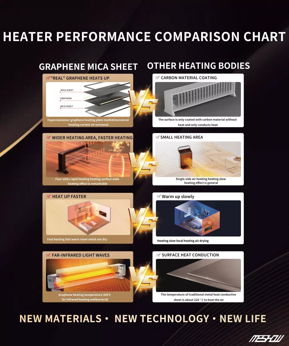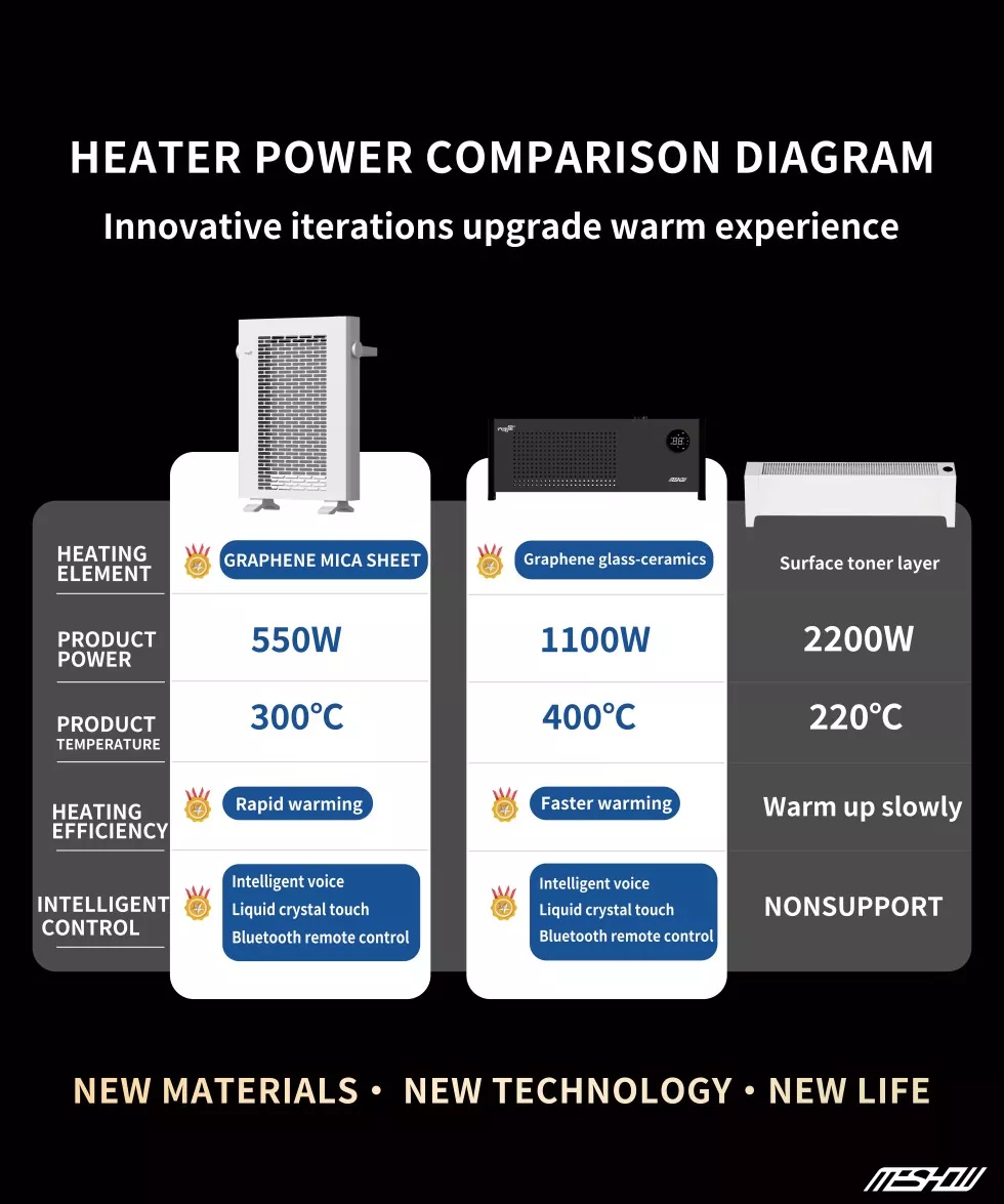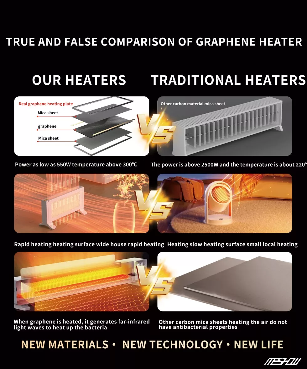 Meshow е врвен производител во кинеската индустрија за опрема за греење, фокусирајќи се на истражувањето и развојот на новиот материјал графен. Електричен електричен грејач со високи графини од 1800W е лансиран. Графен има многу висока термичка стапка на конверзија и не троши енергија. Нема потреба да се грижите за безбедноста, бидејќи Tipping автоматски ќе ја прекине моќта и ќе обезбеди прекумерна заштита на температурата. Графен нема сув воздух како традиционални грејачи и не ослободува штетни материи што можат да предизвикаат алергии на телото.