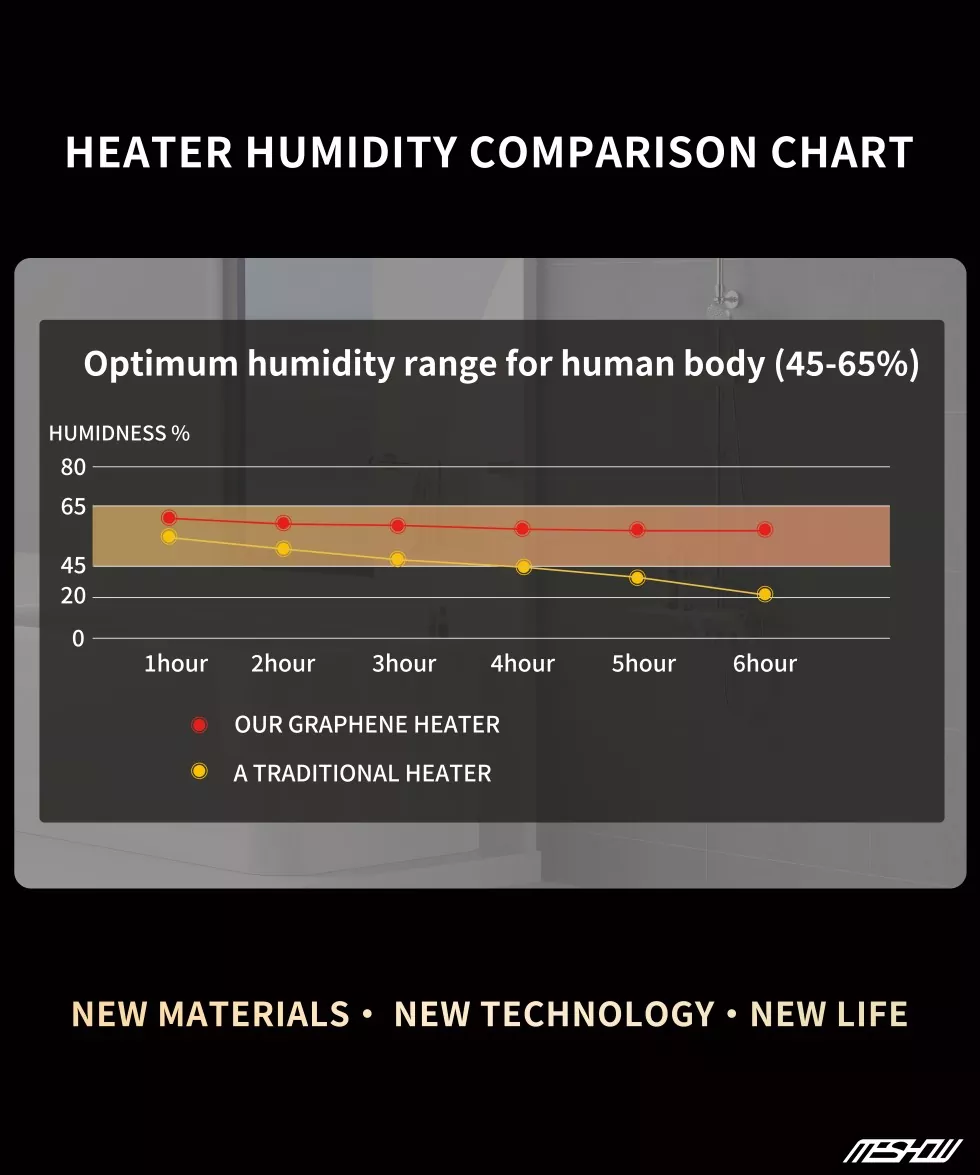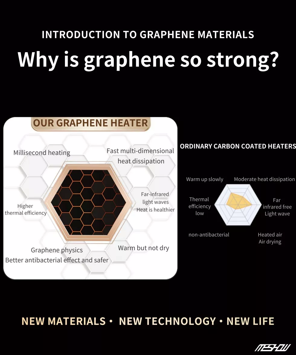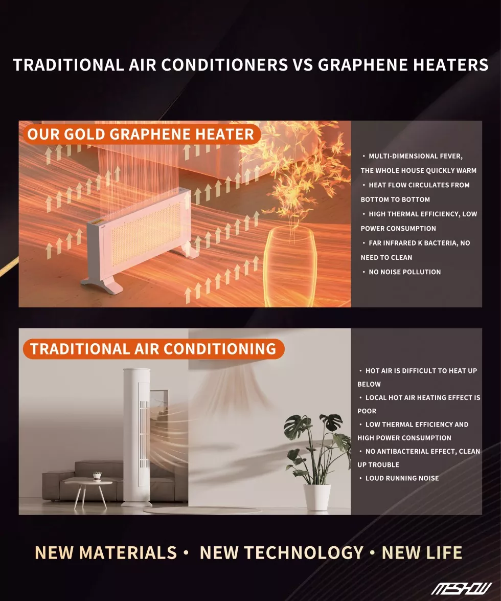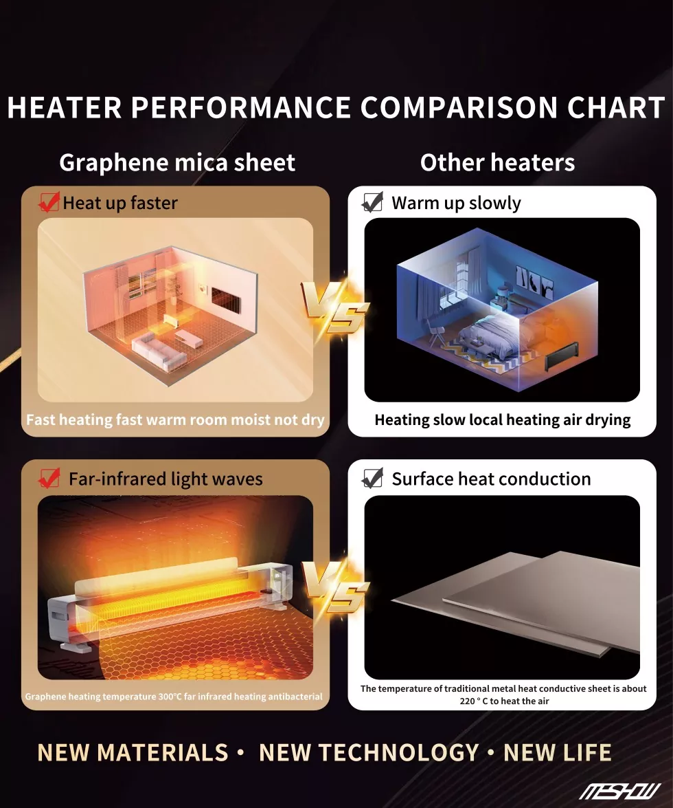 Meshow е врвен производител во кинеската индустрија за опрема за греење, фокусирајќи се на истражувањето и развојот на новиот материјал графен. Електричен електричен грејач со високи графини од 1800W е лансиран. Графен има многу висока термичка стапка на конверзија и не троши енергија. Нема потреба да се грижите за безбедноста, бидејќи Tipping автоматски ќе ја прекине моќта и ќе обезбеди прекумерна заштита на температурата. Графен нема сув воздух како традиционални грејачи и не ослободува штетни материи што можат да предизвикаат алергии на телото.